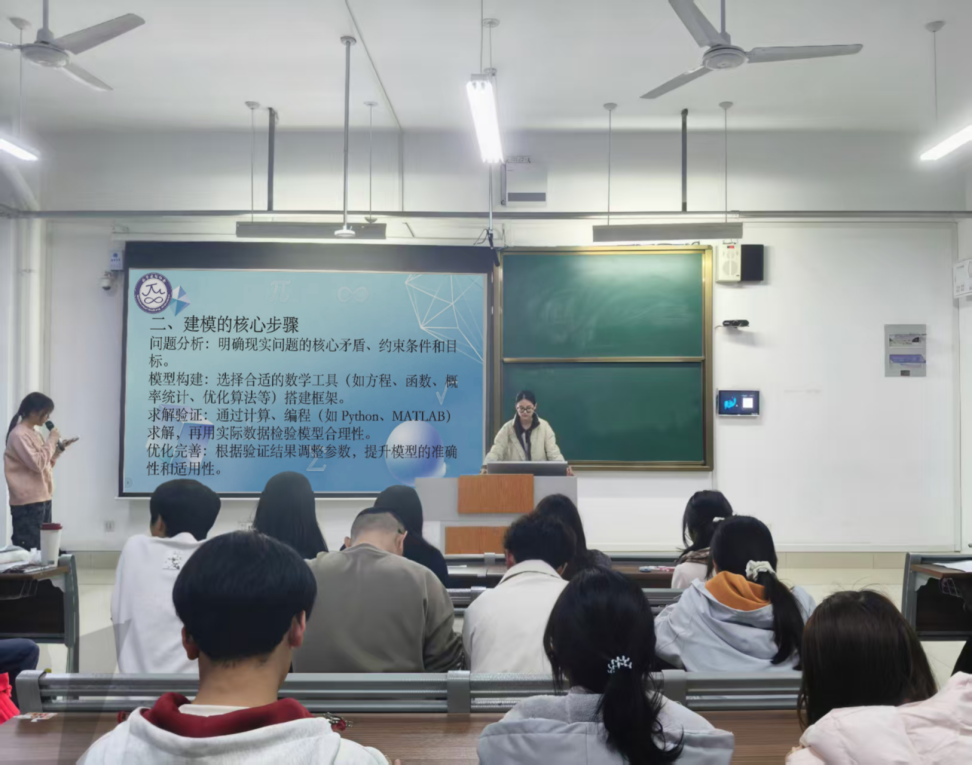 为深化学生对数学建模的理解,帮助其掌握常见建模方法与软件操作、具备完成简单建模任务的能力,4月26日,数学与统计学院数学建模协会于增信楼102教室开展《数学建模——解码真实世界的钥匙》主题讲座,吸引大批建模竞赛爱好者到场聆听。