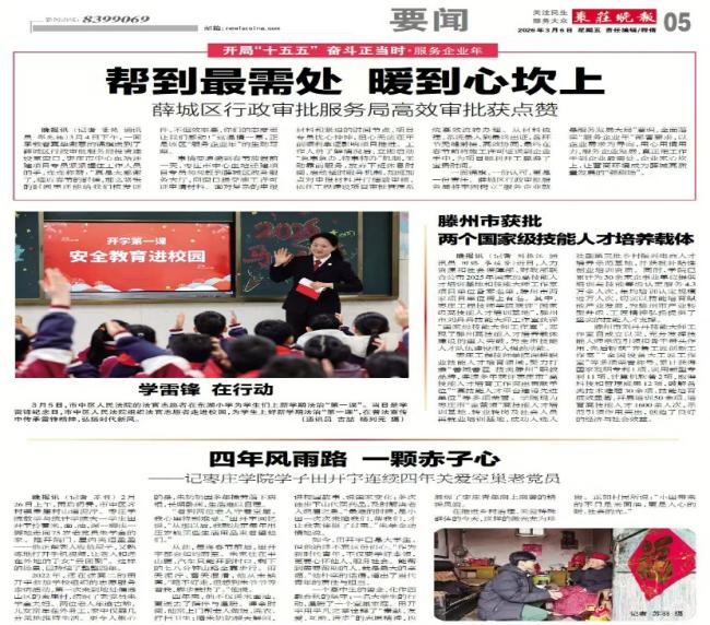 走进鸿鑫聚景社区开展雷锋精神宣讲、反诈宣传,助力社区举办民俗文化体验节等志愿服务,为孤寡老人打扫卫生,为学困儿童辅导数学功课。我院学生田开宇连续四年关爱空巢老党员,以实际行动践行新时代雷锋精神,事迹被《枣庄晚报》报道。